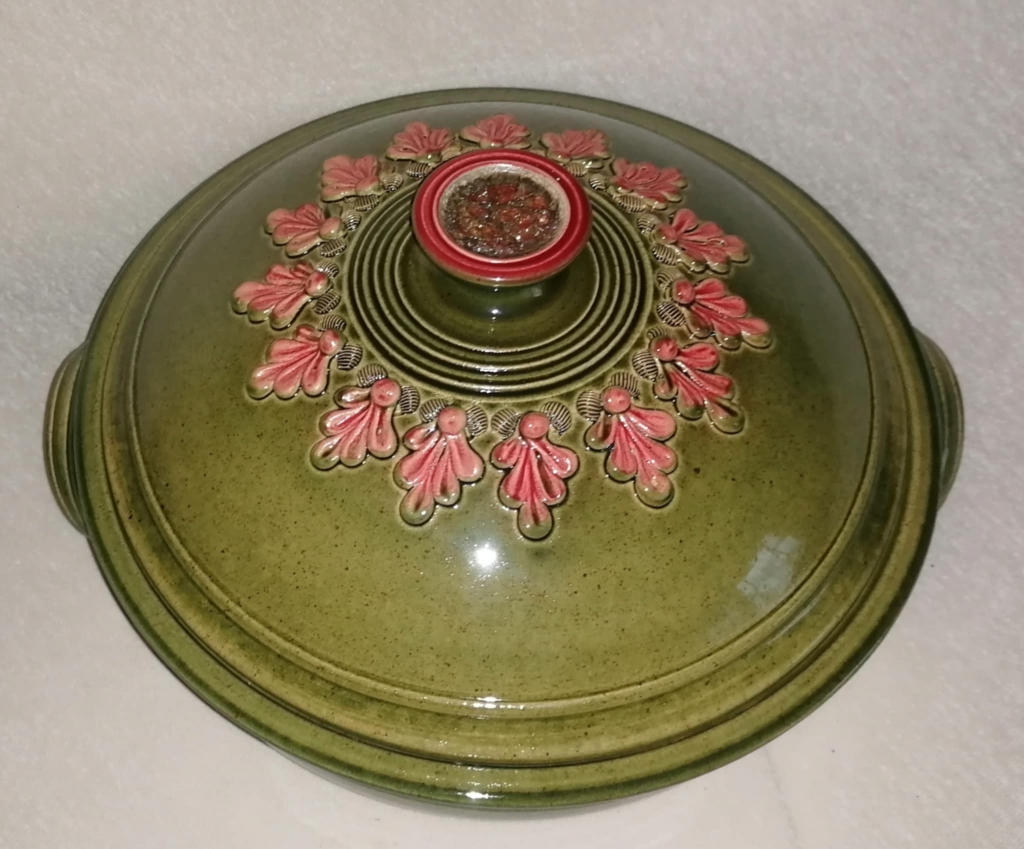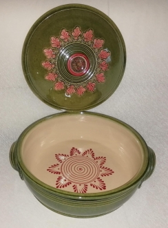 A lapos fedeles sütőtálban nagyszerűen elkészíthetőek bármilyen húsok,rakott ételek,Egyedi mintája ,és színe miatt nagyon szépen mutat a teritett asztalon.Cserépedény sajátossága, hogy a benne lévő ételt nagyon sokáig melegen tartja.A samottos agyagból készült edény kiválóan alkalmas a villany,gáz sütőben való használatra egyaránt.